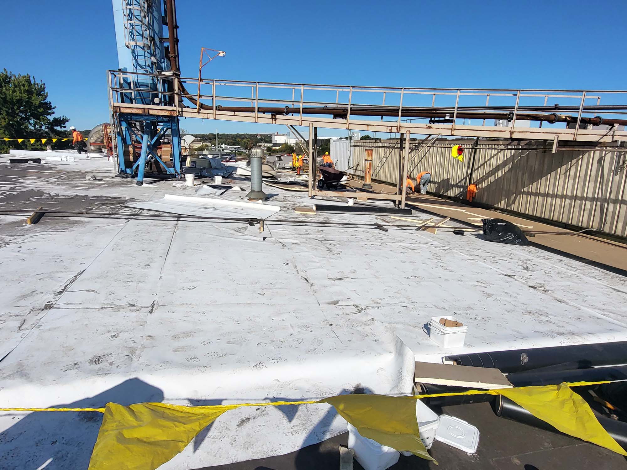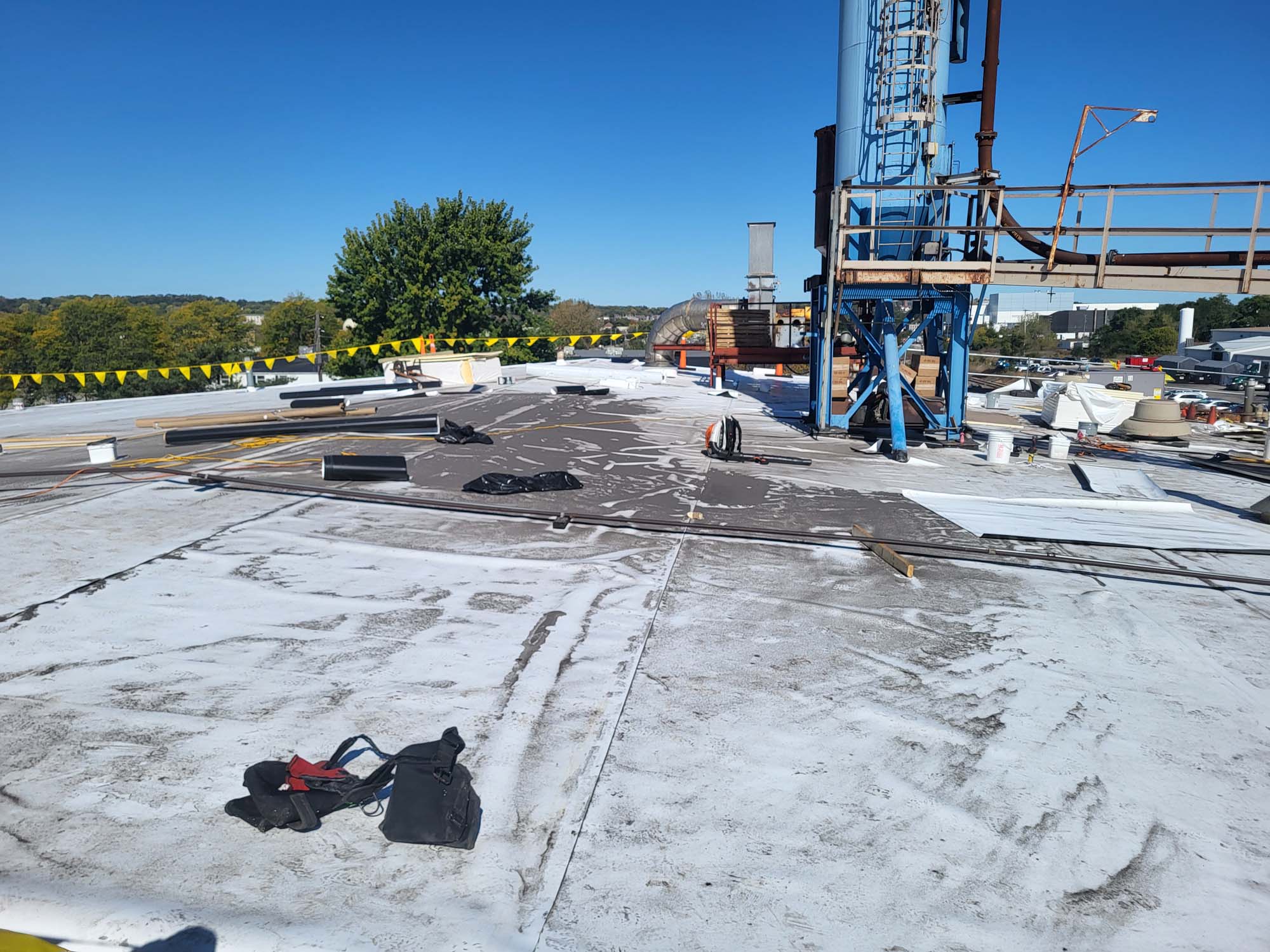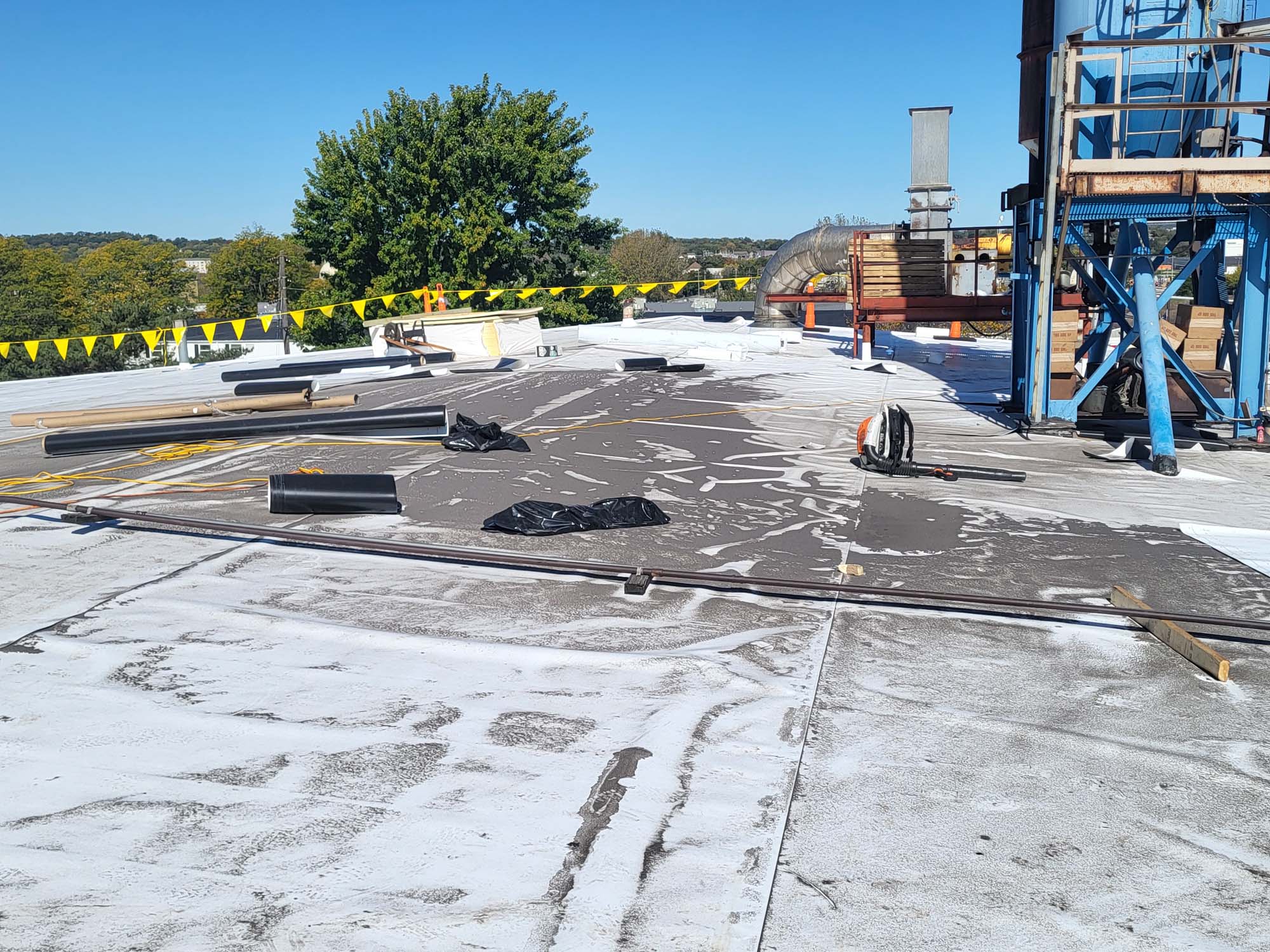 Flat commercial roof with a white reflective surface, bordered by yellow caution tape and orange cones. There are a few rooftop units and vents, and trees are visible in the background under a clear blue sky.