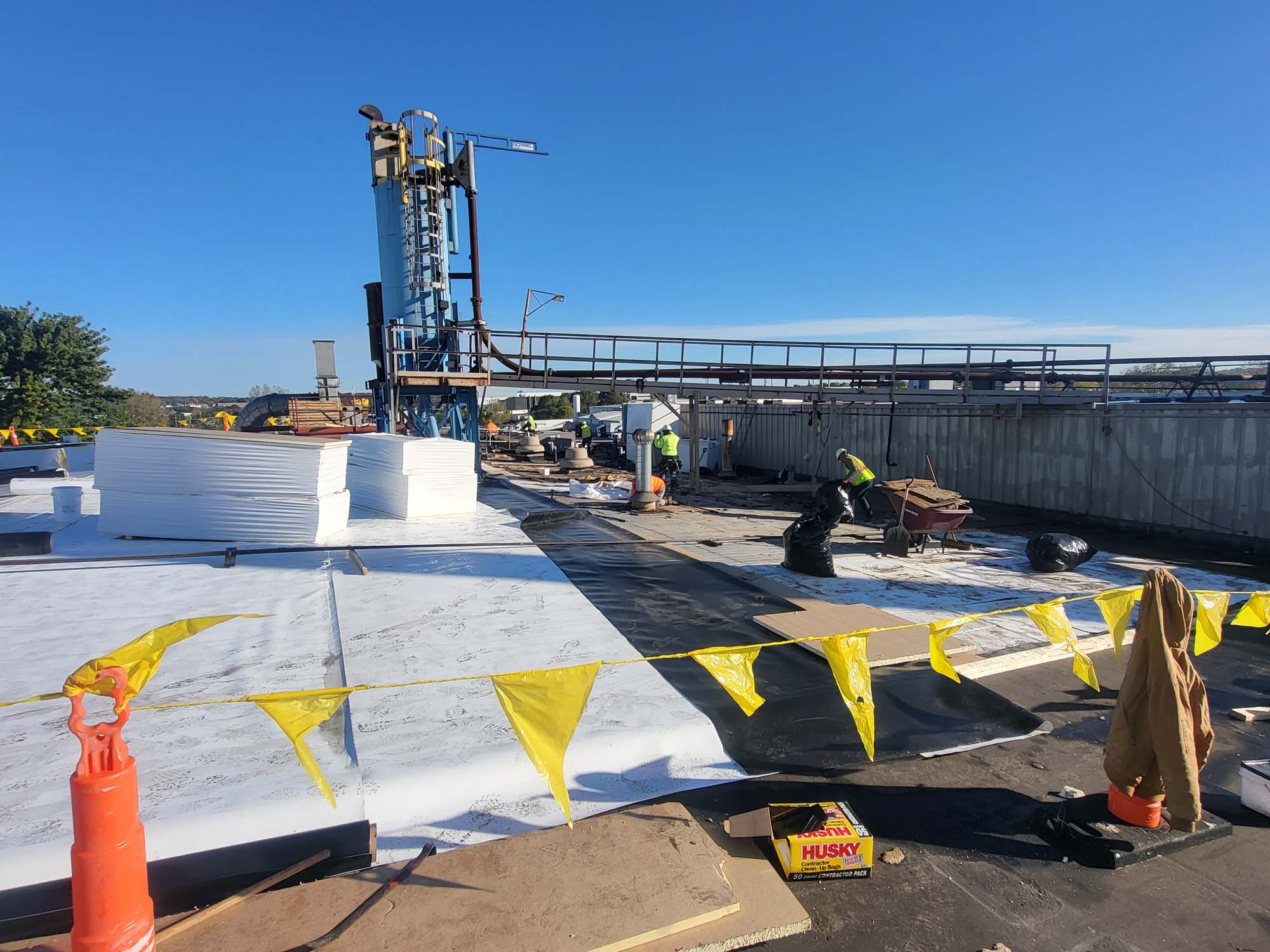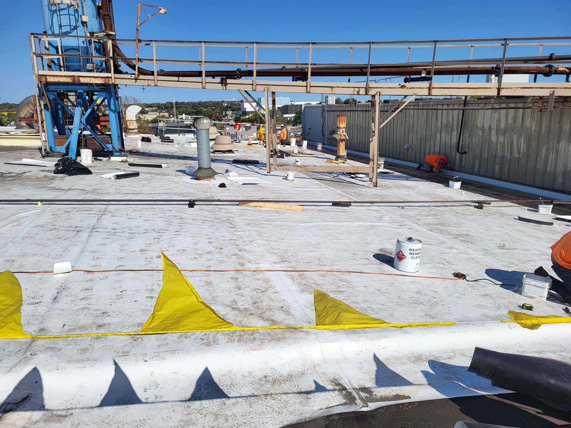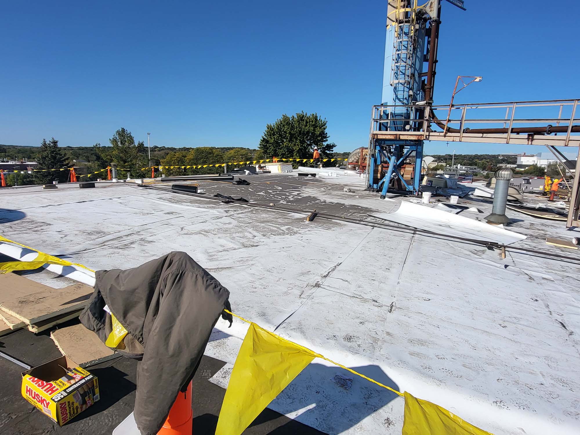 Flat commercial roof with a white reflective surface, bordered by yellow caution tape and orange cones. There are a few rooftop units and vents, and trees are visible in the background under a clear blue sky.